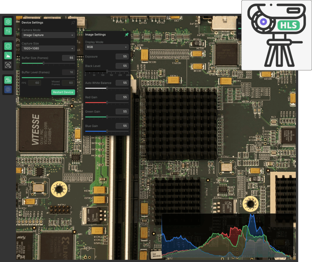 These two examples illustrate a complete machine vision capture system using the FrontPanel API, HDL, and Platform. The HLS (high-level synthesis) version includes automatic color correction and black level implemented into the image pipeline using HLS.