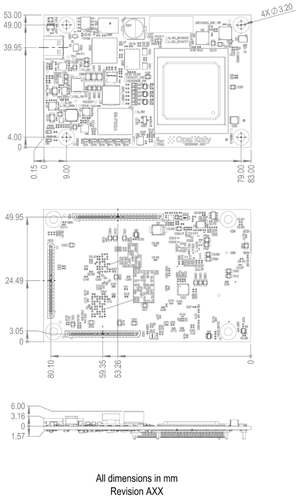 The XEM8305 PCB is 83 x 53mm (3.27 x 2.09″) with four mounting holes placed near the corners. These mounting holes are electrically isolated from all signals on the XEM8305. USB Type C is located along one edge of the PCB. Two 80-pin and one 100-pin expansion connectors are available on the bottom-side of the PCB. Power is connected through the expansion connectors.